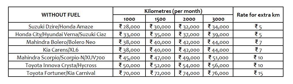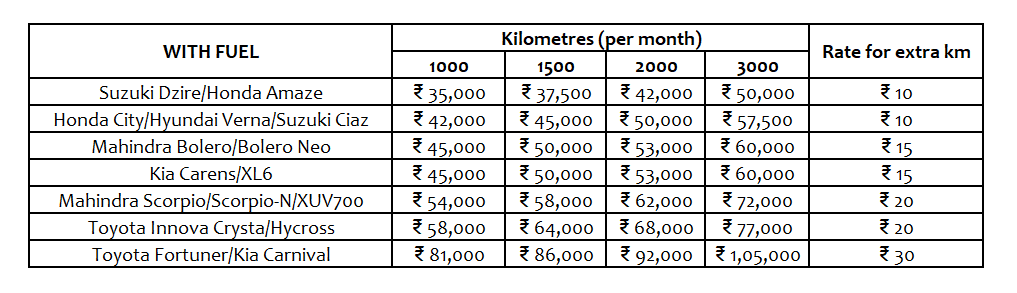 The prices are inclusive of fuel, driver, and GST. Tolls and parking fees shall be extra.